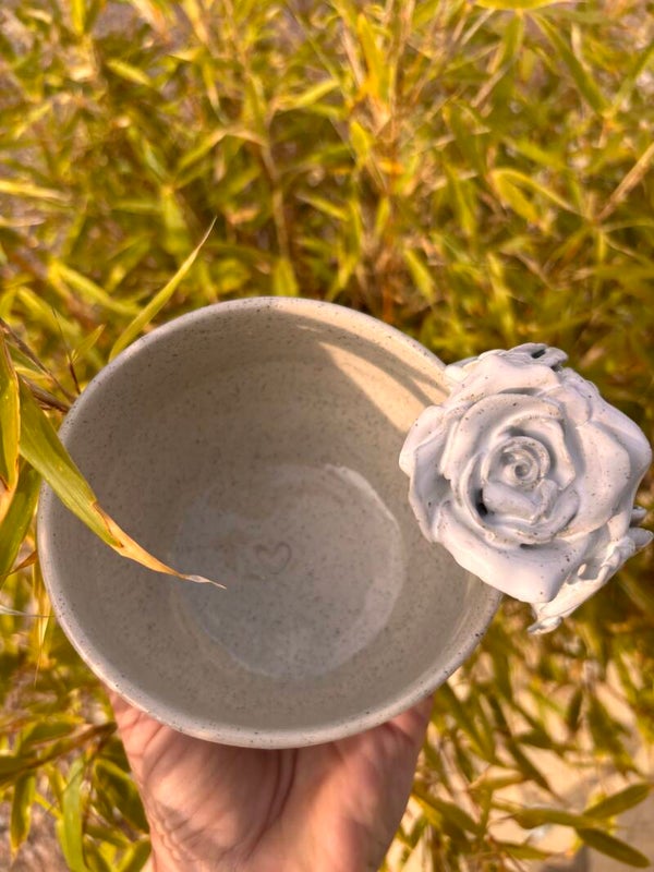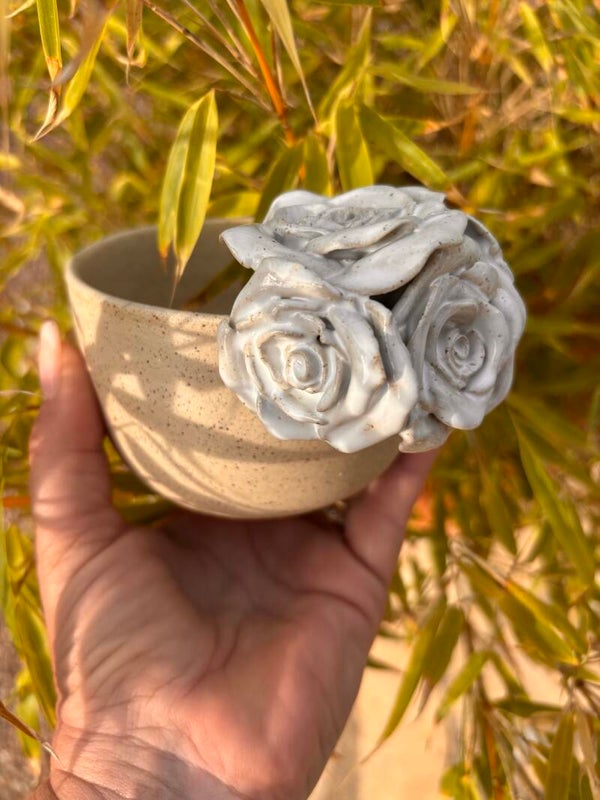 Bol fait main en grès naturel, décoré de quatres délicates roses.