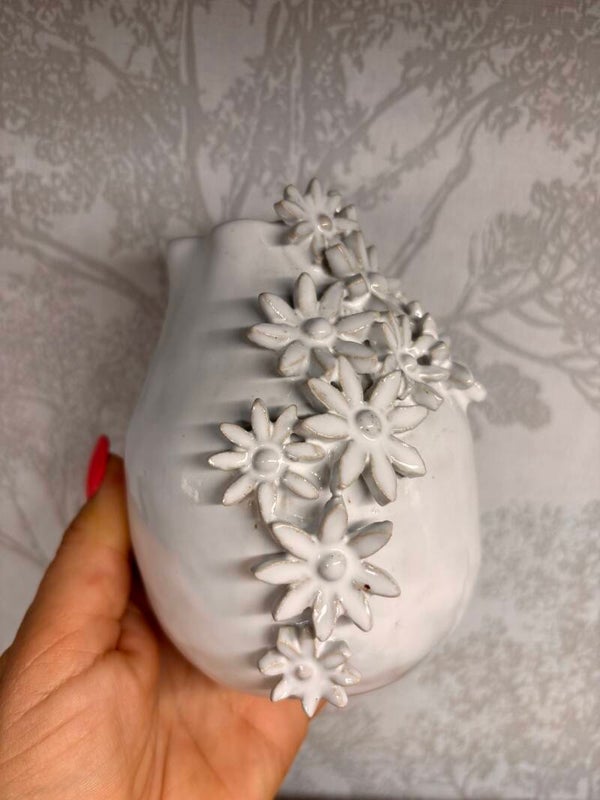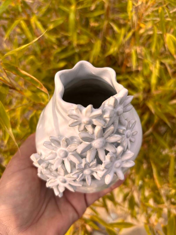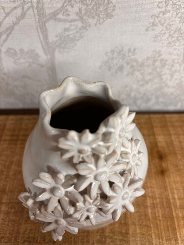 Vase en grès beige recouvert d'un email blanc avec descente de plusieurs petites fleurs.