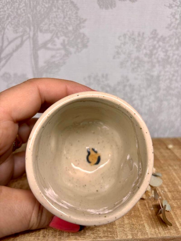 Mug en grès beige, avec petites taches Léopard peintes a la main et recouverte d'un email transparent.