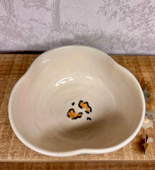Bol en grès beige, avec petites taches léopard peintes a la main et recouvert d'un email transparent.