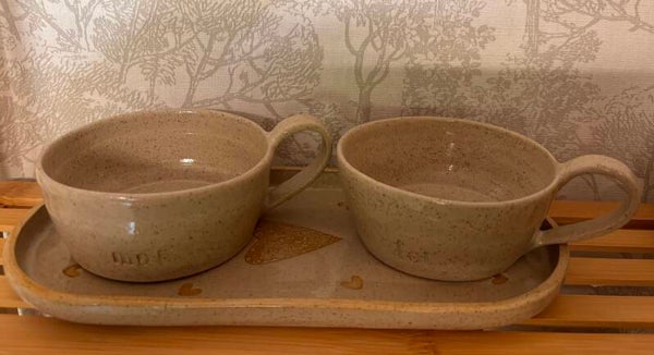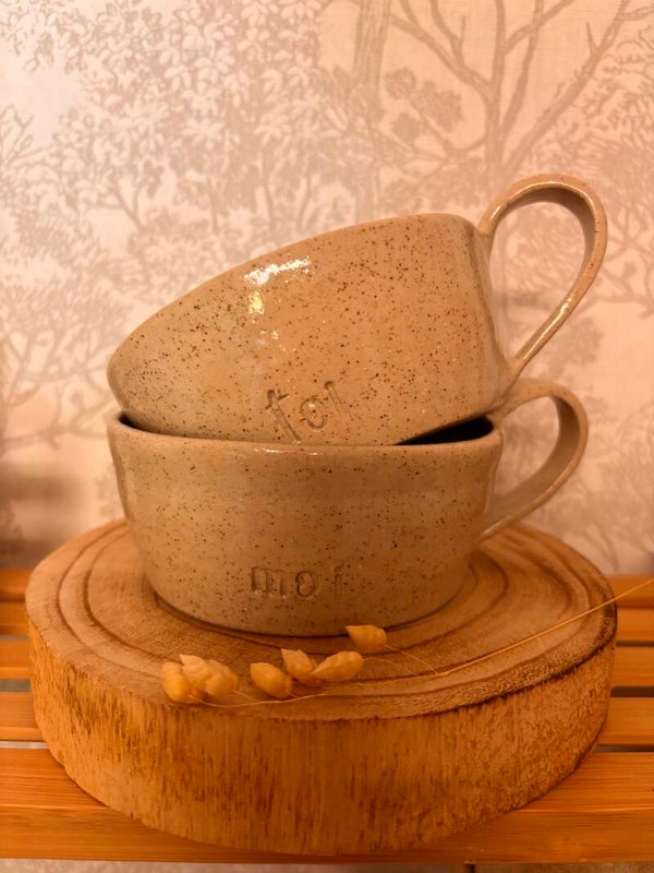 Bol en grès beige pyrité recouvert d'un email transparent avec inscription des mots "TOI" et "MOI ".