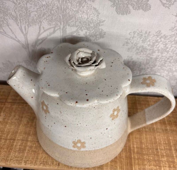 Théière en grès beige pyrité recouvert d'un email blanc moucheté avec des petites fleurs autour.