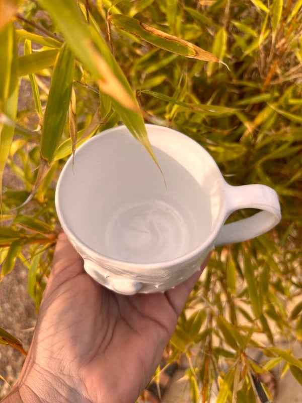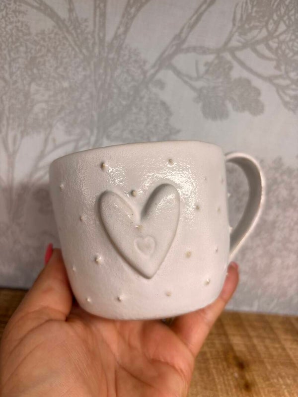 Tasse en grès blanc recouverte d'un email blanc avec un grand coeur au centre.