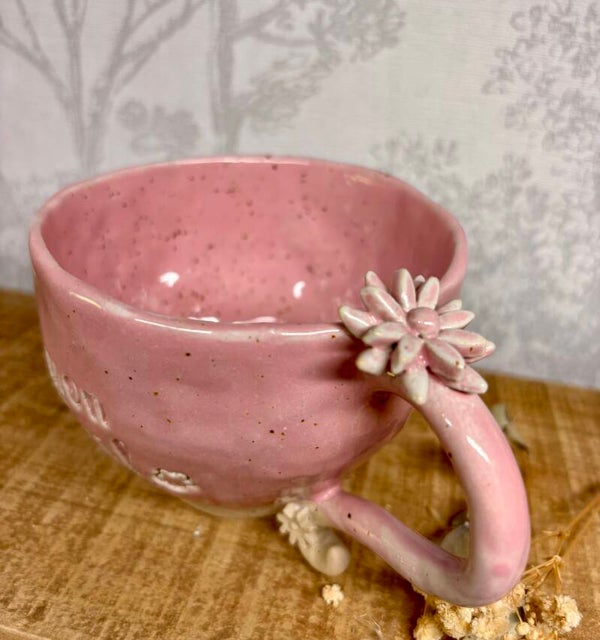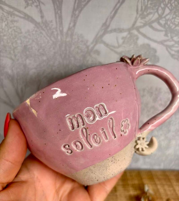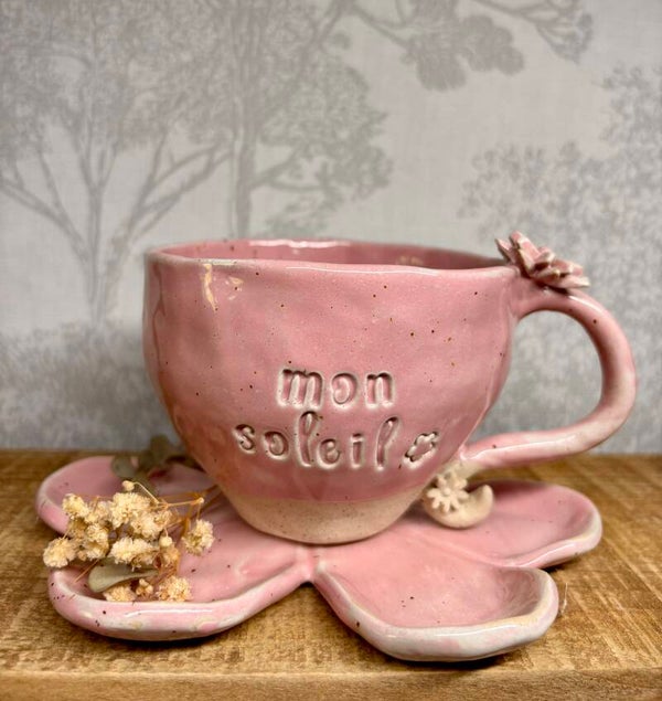 Enssenble composé d'une tasse et d'une assiette en grès beige pyrité recouvertent d'un email rose, une petite fleur sur l'anse et inscription "Mon soleil" sur le devant.