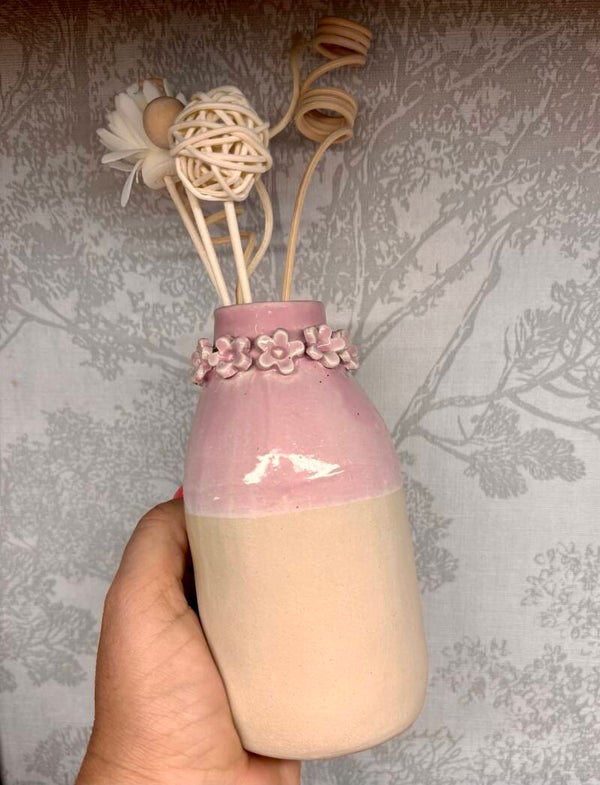 Petit vase rose avec couronne de fleurs en grès blanc, recouvert de moitié d'un émail rose et grès brut en dessous.