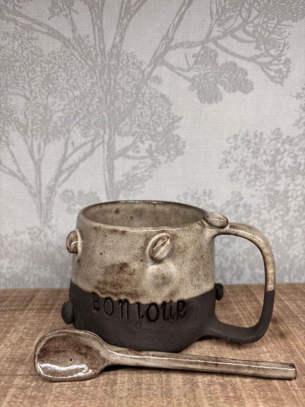 Grande tasse en grès noir avec des petits grains de café ainsi que l'inscription *bonjour* sur le devant et recouverte de moitié d'un email beige.