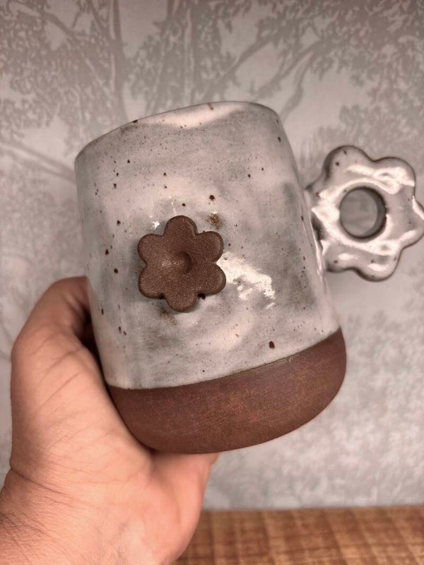 Grande tasse en grès roux avec anse fleur, ainsi qu'une fleur sur le devant et recouverte de moitié d'un email beige moucheté.