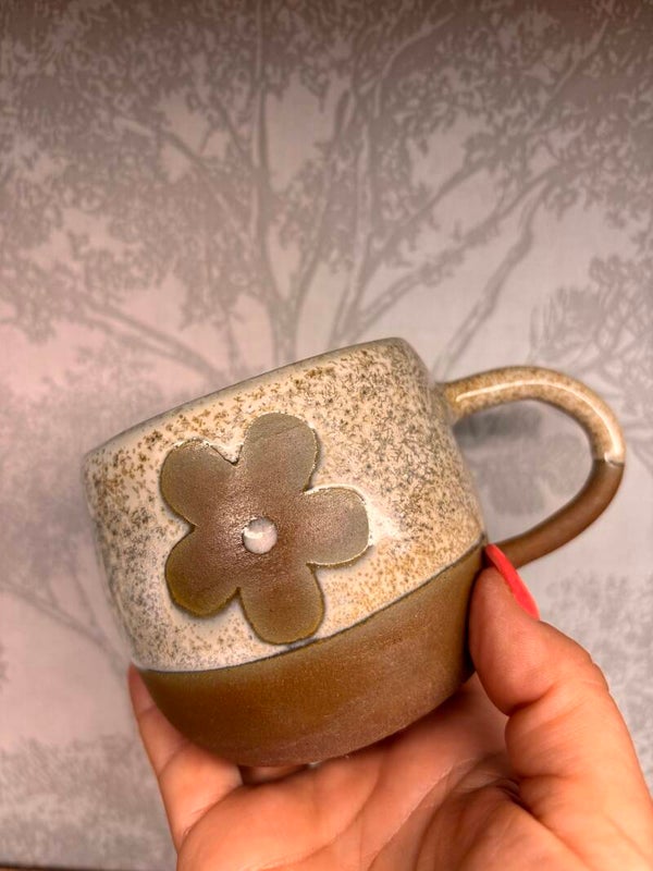 Tasse en grès roux avec grande fleur rousse sur le devant et recouverte d'un email beige moucheté.