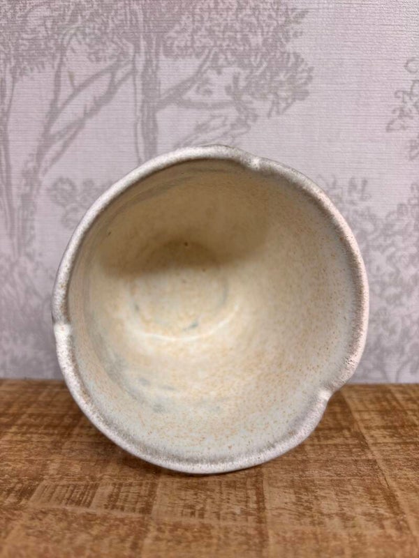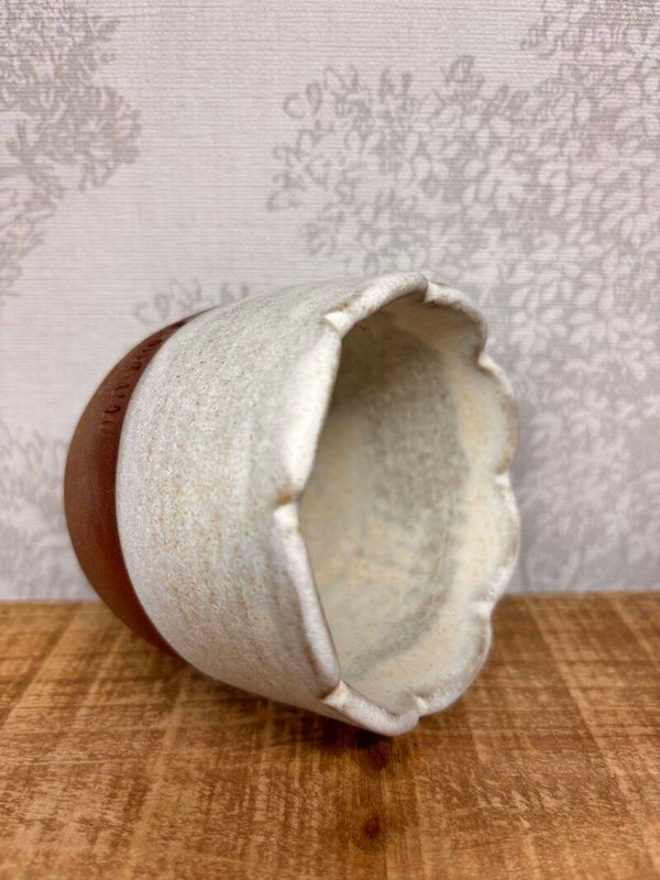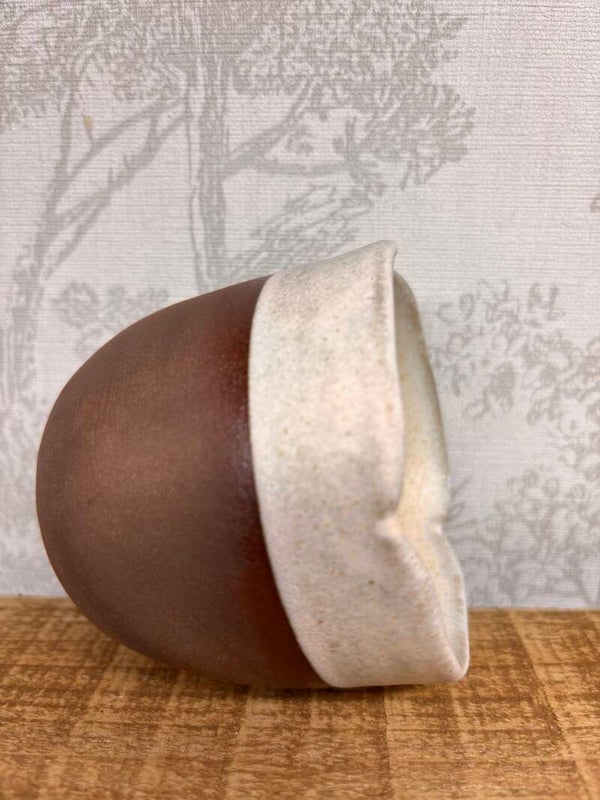 Mug forme fleur en grès roux , avec inscription du mot Amour et du mot Rêve sur le devant et recouverte de moitié d'un email blanc mat.