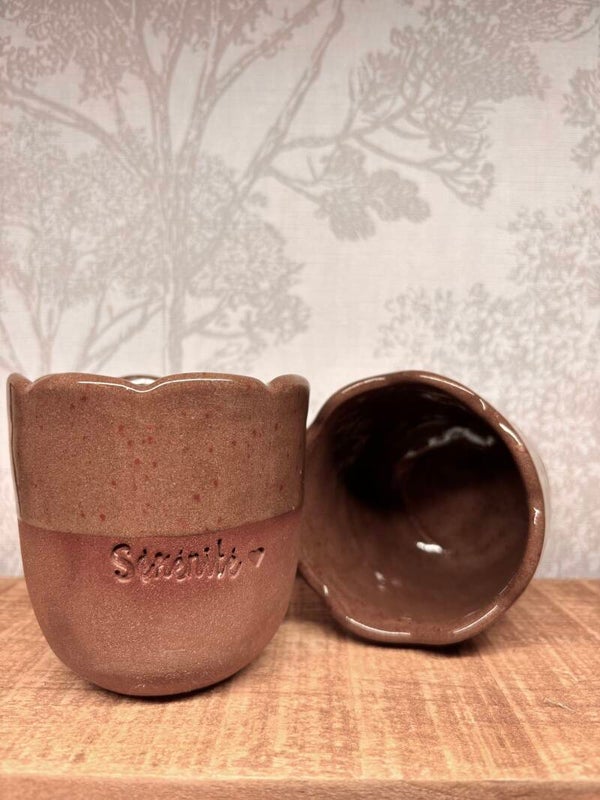 Mug forme fleur en grès roux , avec inscription du mot tendresse et du mot sérenité sur le devant et recouverte de moitié d'un email caramel moucheté .