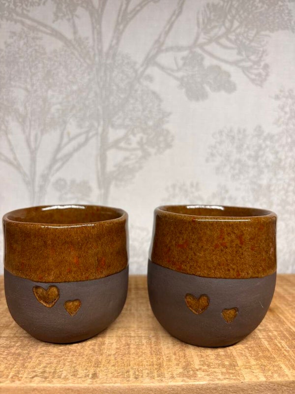 Mug en grès noir avec deux petit cœurs et recouvert de moitié d'un email caramel moucheté .