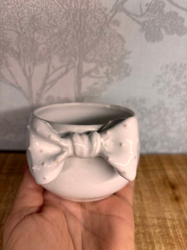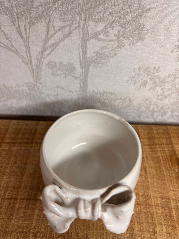 Bol en grès beige recouvert d'un email blanc avec un grand noeud sur le devant.