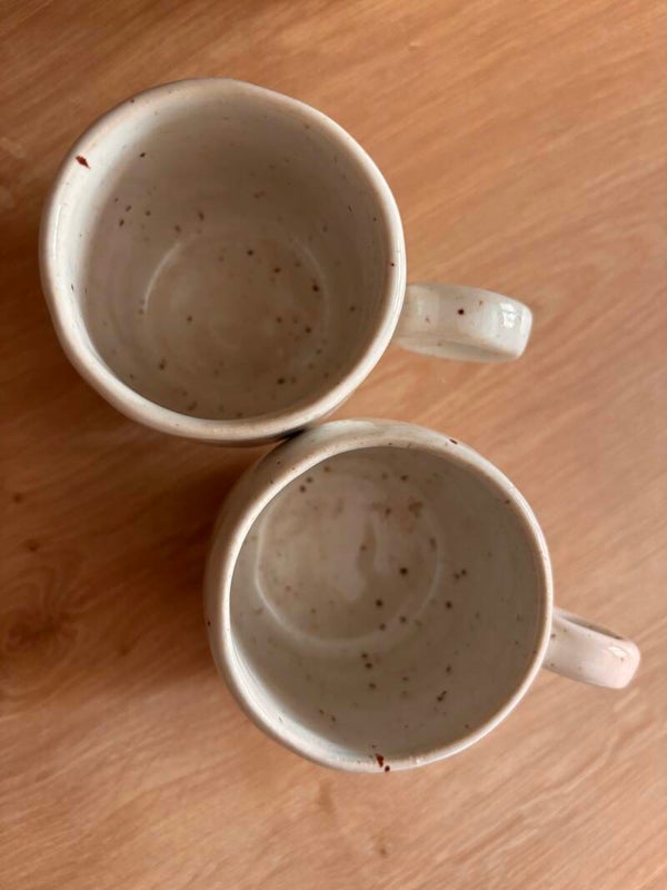 Tasse en grès beige avec un coeur au centre et recouverte d'un email blanc moucheté.