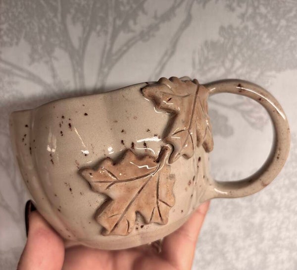 Tasse en grès beige en forme de citrouille, avec 2 feuilles sur le devant et recouverte d'un émail beige moucheté.