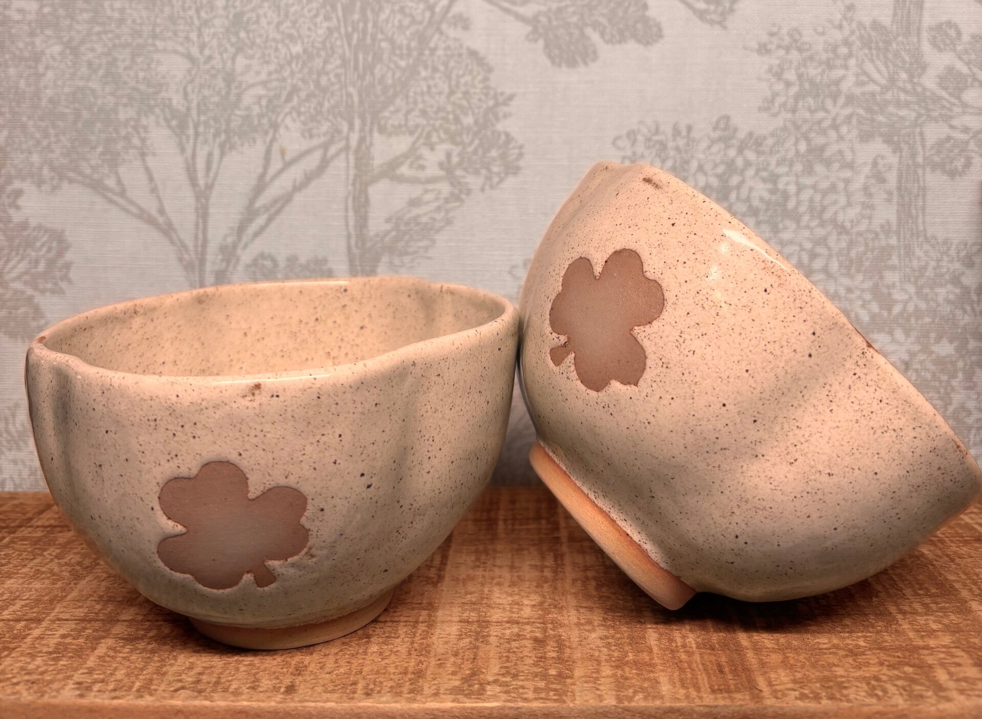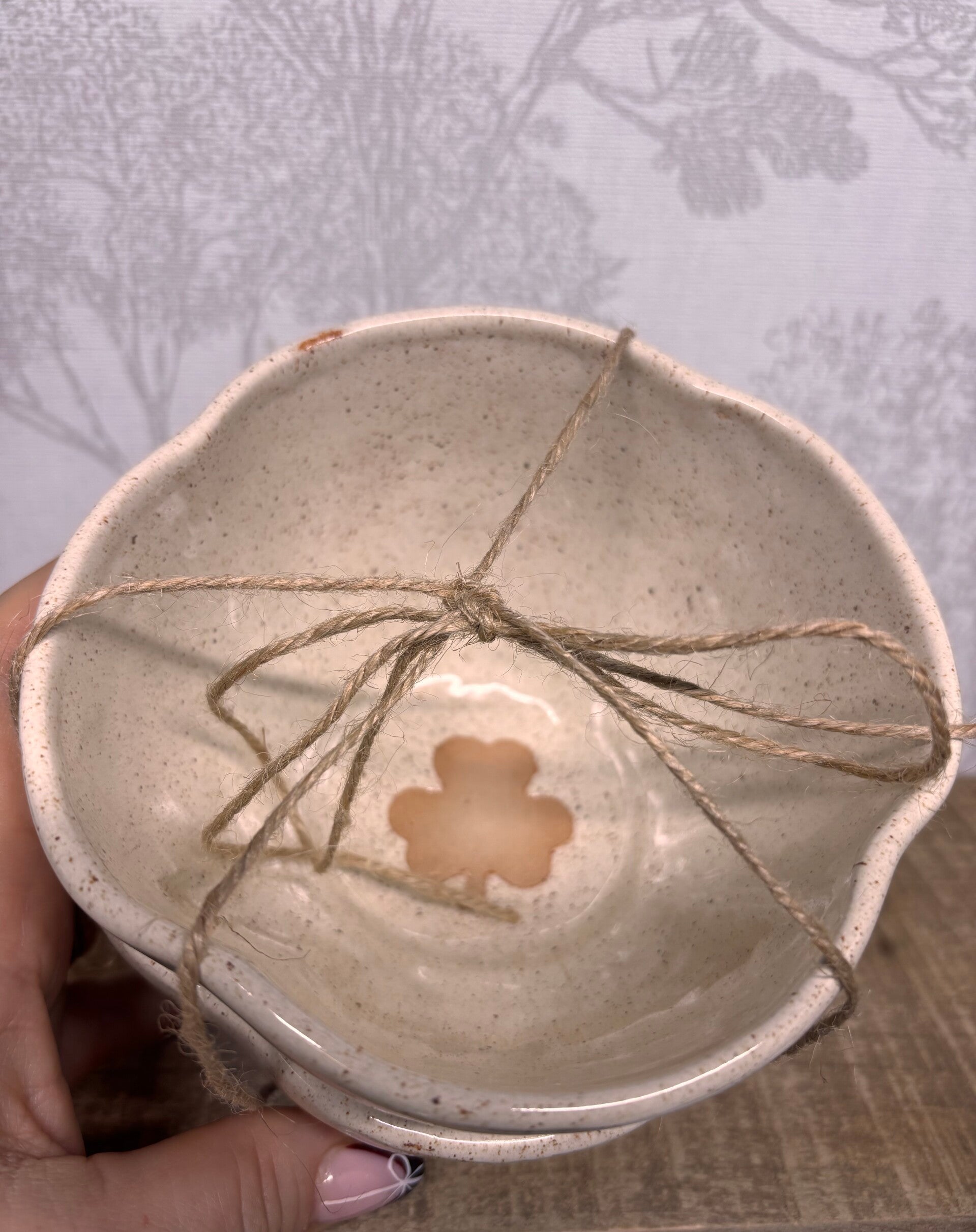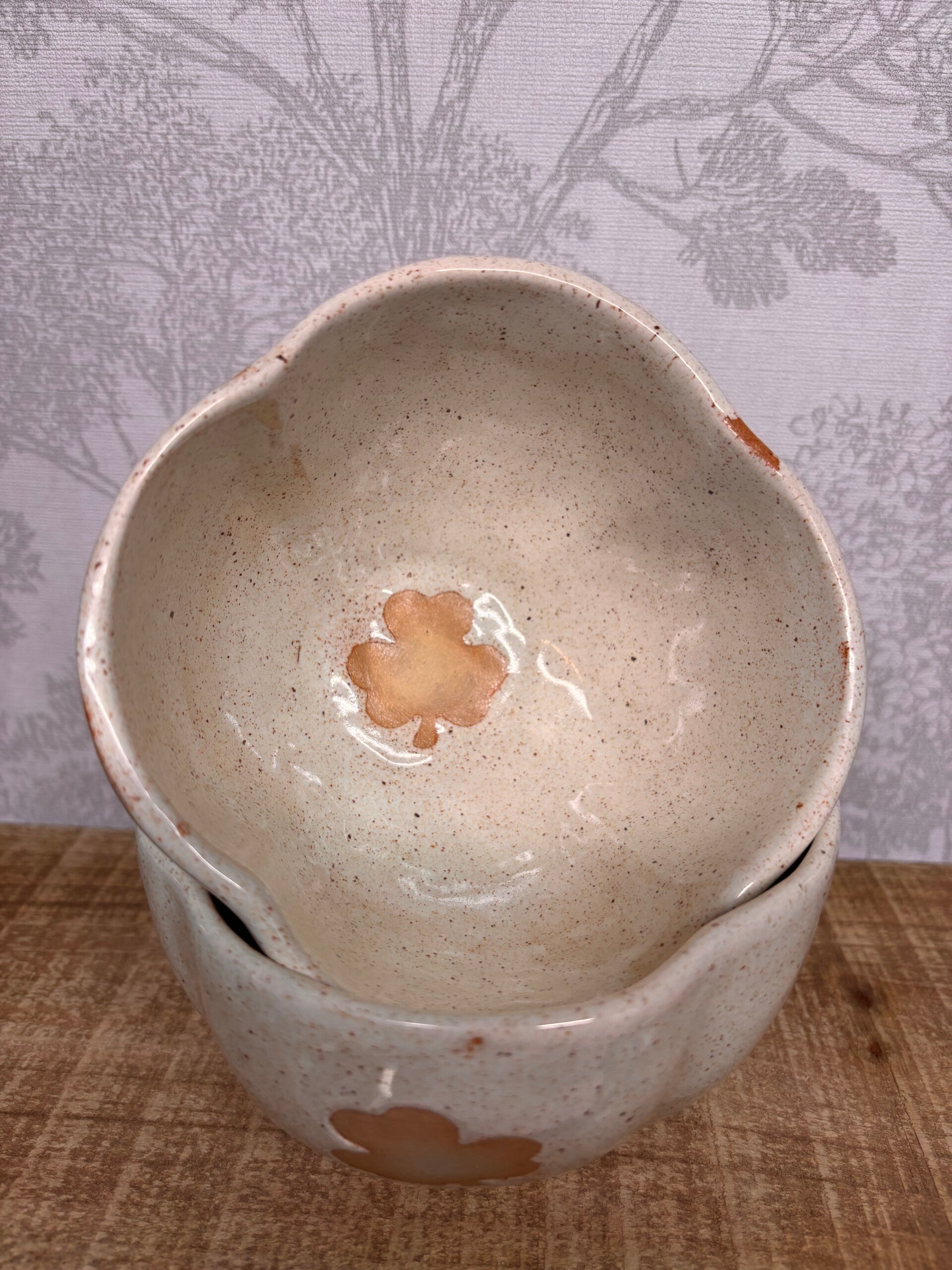 Grand Bol en grès recouvert d'un email beige moucheté avec trèfle a l'intérieur ainsi qu'autour du bol a l'extérieur.
