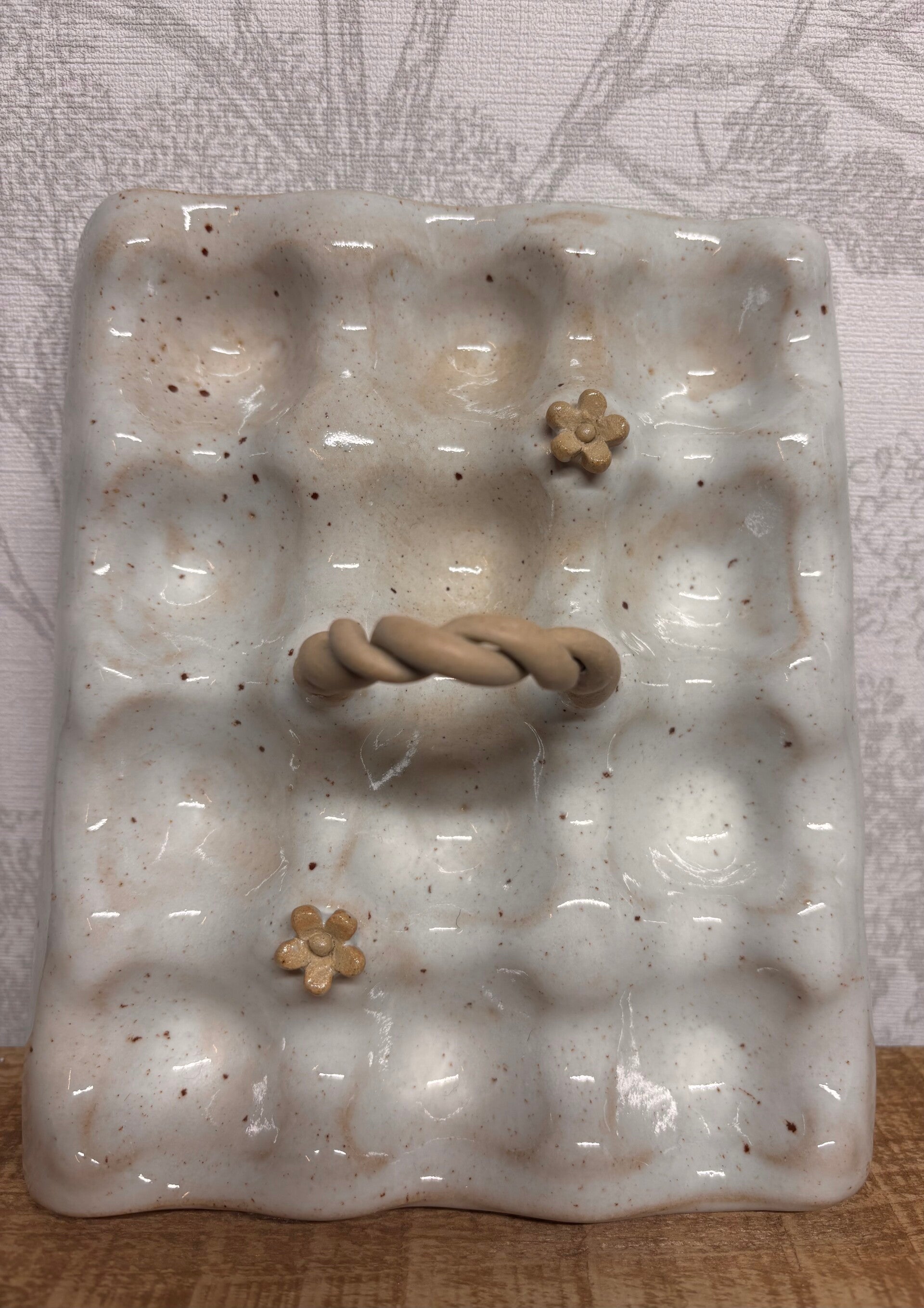 Porte oeufs en grès, recouvert d'un email blanc moucheté .
