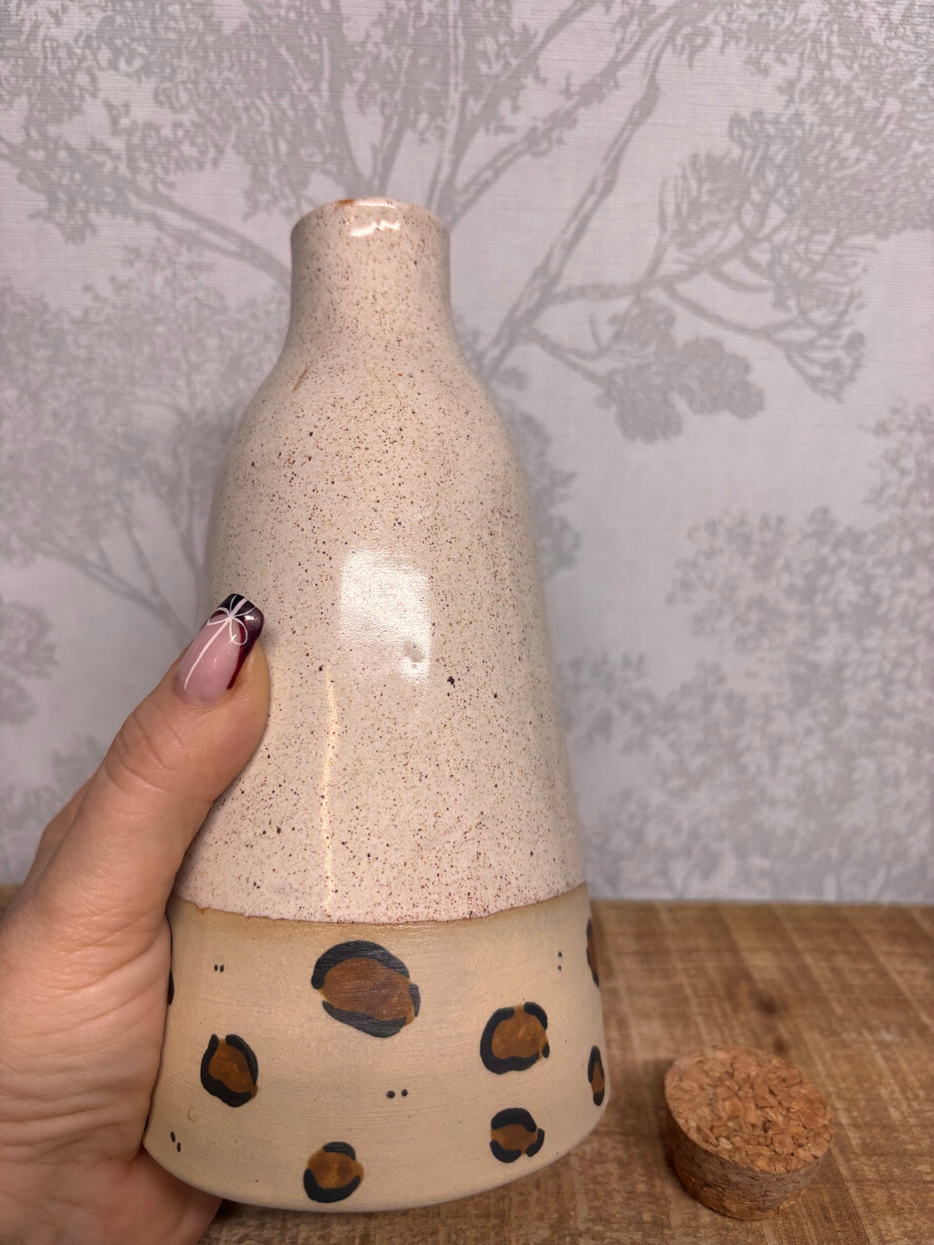 Bouteille en grès avec bouchon en liège, des petites taches léopard peintes a la main sur le bas et recouverte d'un email beige moucheté.