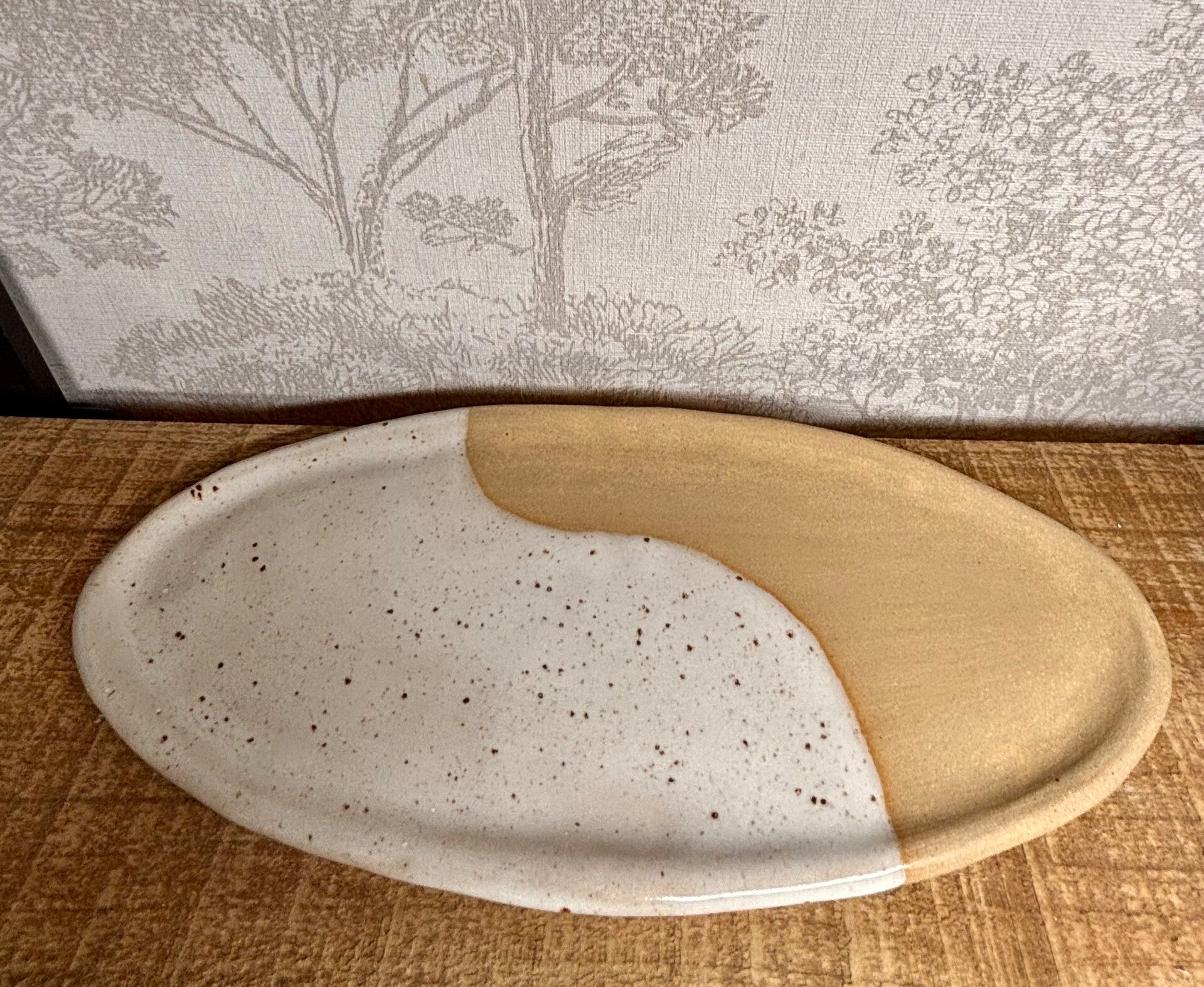 Plat ovale en grès beige recouvert une parti d'un email blanc moucheté en forme de vague.