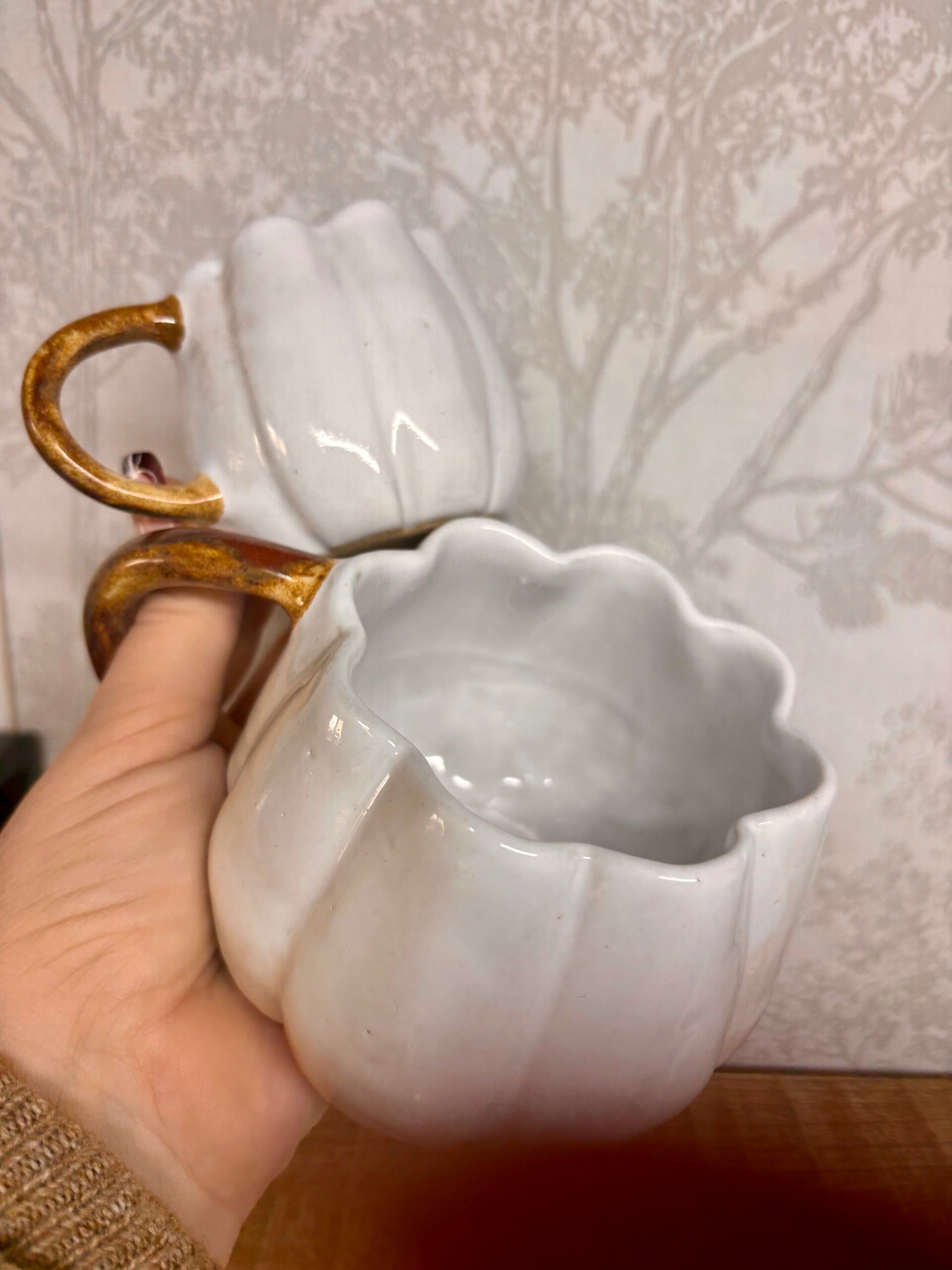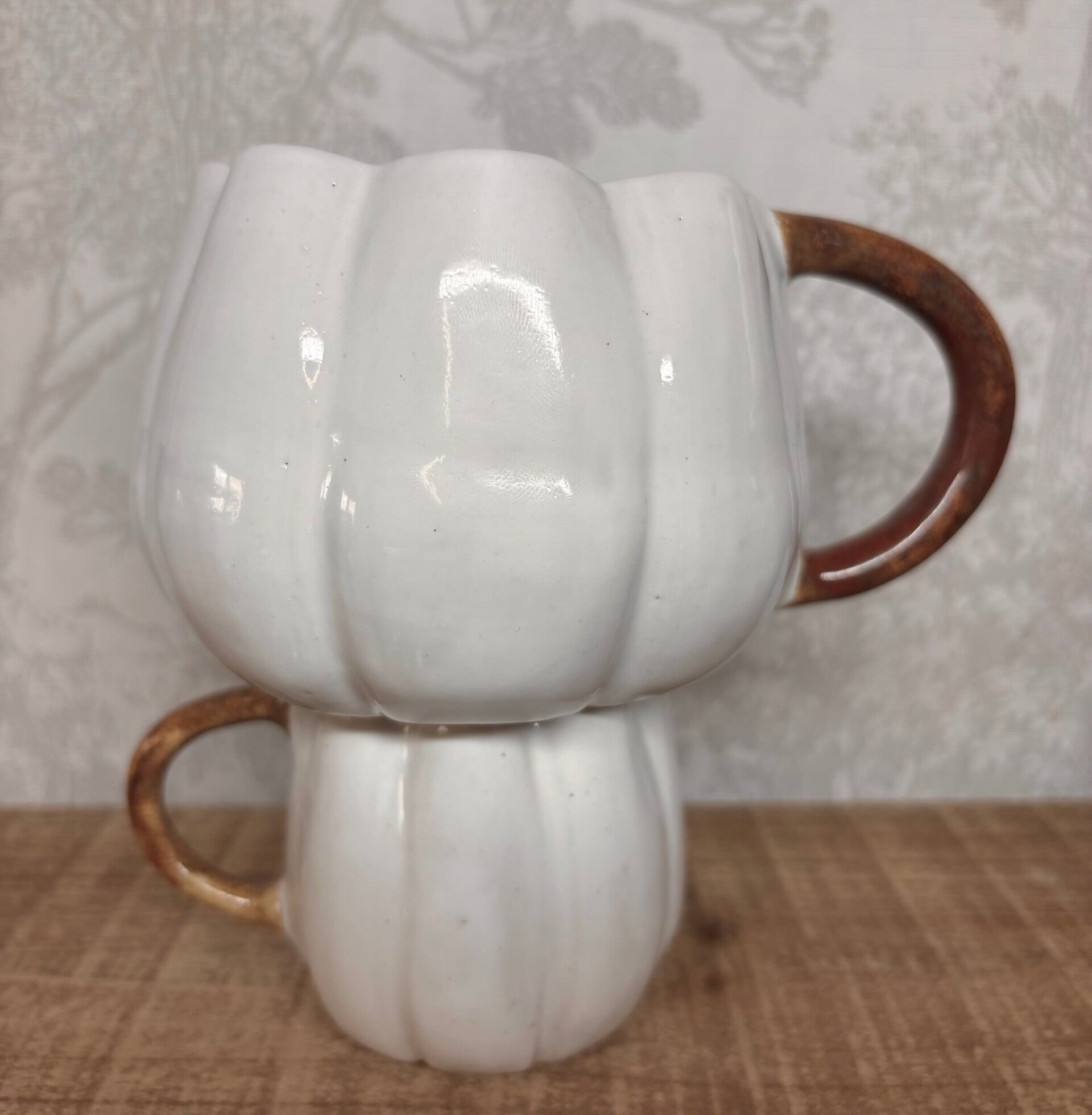 Elles sont en grès beige en forme de citrouille, recouvertes d'un émail blanc avec la poignée couleur caramel.
