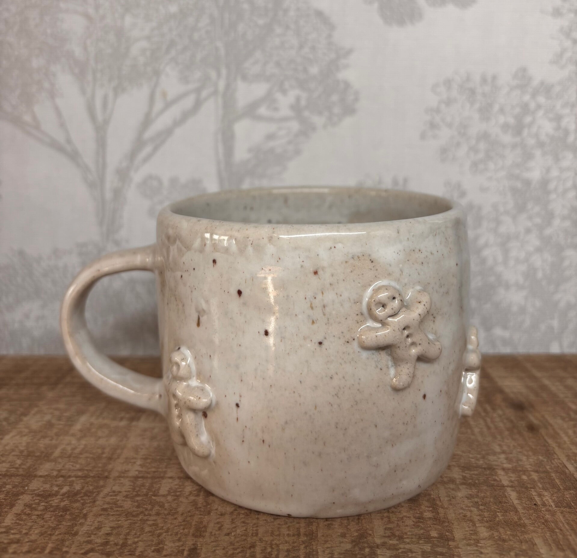 Grande tasse en grès beige pyrité, recouverte d'un email blanc moucheté ,avec petits bonhommes en pain d'épice tout autour de la tasse.