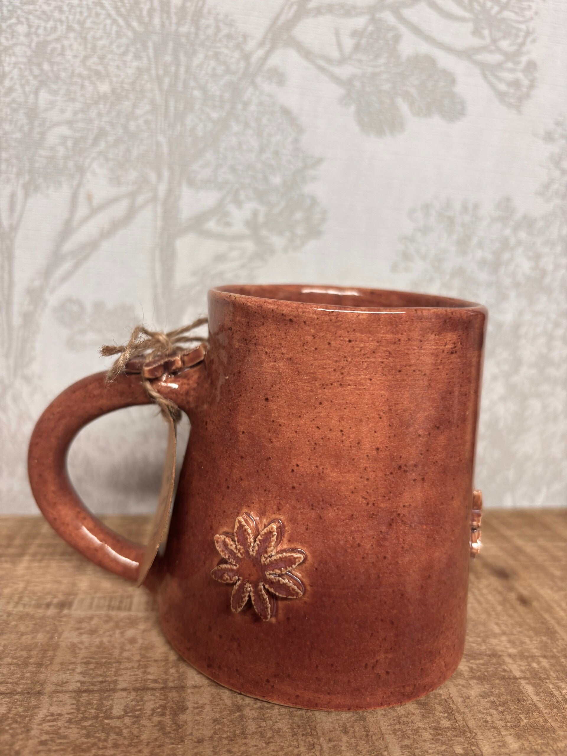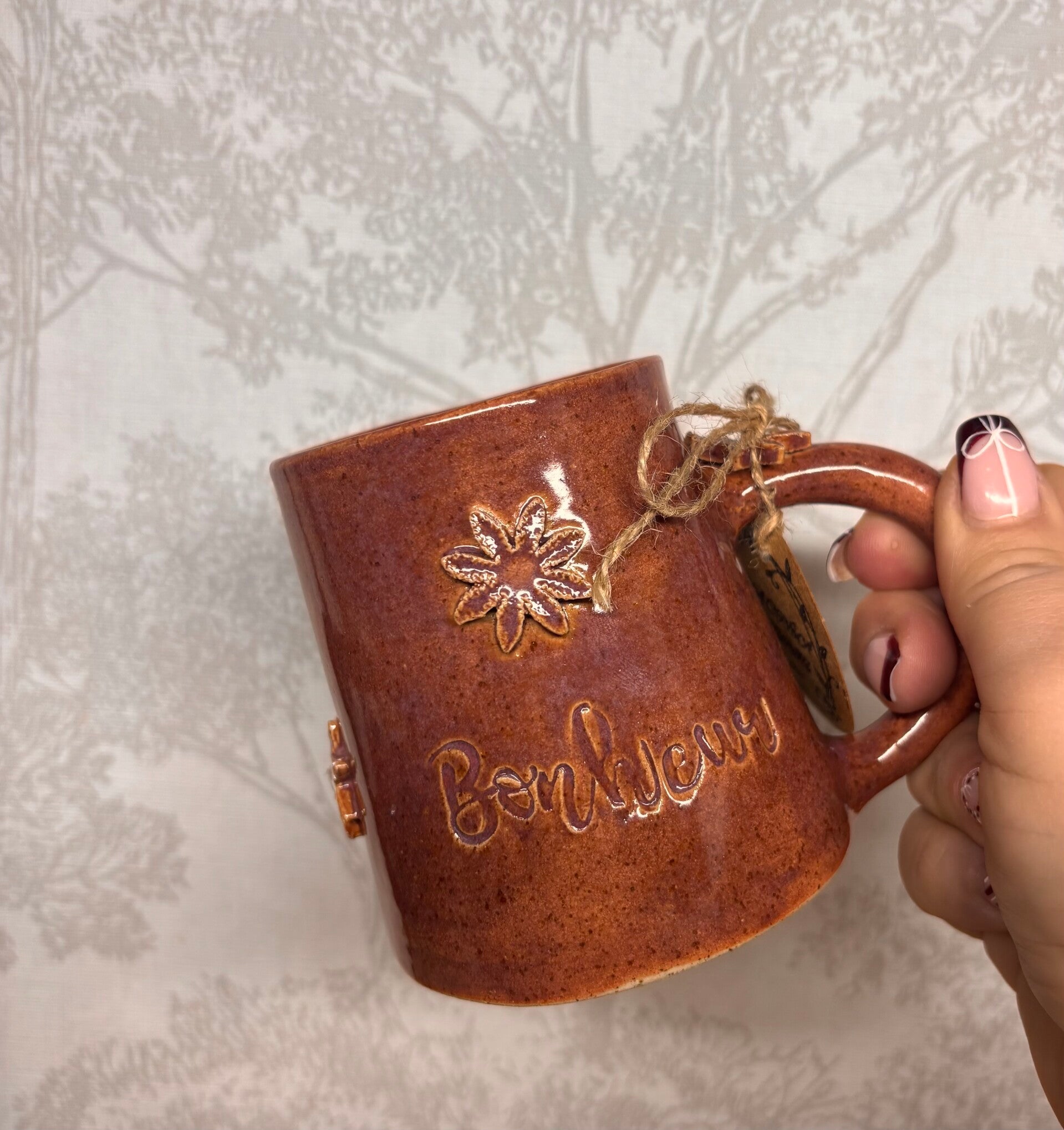 Tasse en grès beige pyrité avec inscription du mot "Bonheur" ainsi que l'aplication de fleurs autour de la tasse, recouverte d'un email rose/bordeau .